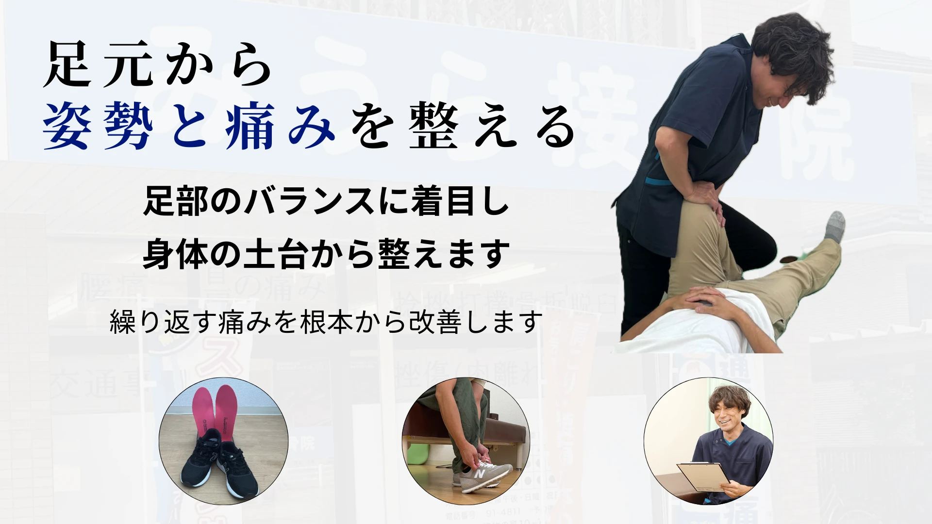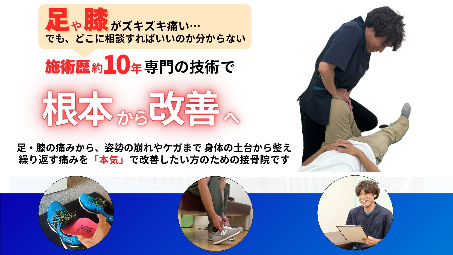 当院は、足や膝の痛み、外反母趾や扁平足など「下肢障害」に特化した接骨院です。